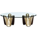AICO Furniture Houston Cocktail Table 9095201-816. The Houston Cocktail Table is a striking fusion of sculptural artistry and modern elegance. Its fluid base, finished in a luxurious gold tone with a contrasting walnut-hued back, creates a captivating interplay of light and shadow. The tempered glass tabletop offers a clear view of the artful foundation, allowing the design to take center stage. This statement piece is sure to elevate your living space with its bold yet sophisticated presence.