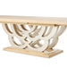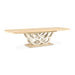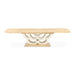 AICO Furniture Camellia Field Rectangular Pedestal Dining Table in Caramel 9090002-134. The Camellia Field Rectangular Dining Table brings artistry and versatility to your dining experience. Crafted with a warm pecan mahogany veneer top featuring a subtle camellia marquetry design, this table rests on a striking antique gold pedestal base. Extendable with two 22-inch leaves, it's perfect for intimate gatherings or larger celebrations, making it the centerpiece of any dining space.