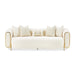AICO Furniture Sassani Sofa Crepe in Gold LFR-SSNI815-CPE-806. The Sassani Sofa redefines contemporary elegance with its plush jacquard chenille upholstery and smooth, sculpted silhouette. Paired with soft, woven jacquard pillows, this piece invites you to sink into its luxurious embrace. The glint of gold metallic accents and sleek legs add a touch of refined glamour, making this sofa a stunning centerpiece for any modern living space.