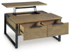 Give your space a sleek, urban edge with this lift-top coffee table. A light brown wood-tone finish and a contrasting gunmetal gray frame create a modern mixed-material look that pairs effortlessly with today's sofas and sectionals. The spring-lift top glides up to create a convenient workspace or dining surface, while dual smooth-gliding drawers keep remotes, tech and clutter neatly out of sight. This table is polished, put together and needs a good home.