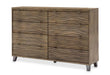 - Constructed with Acacia wood solids, a Mindy veneer in a Boardwalk finish, and a carved wave pattern