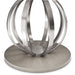 - Spherical pedestal is constructed with arcing stainless steel elements and a round wooden base