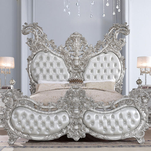 Dimensions: EK Bed: 88"L*86"W*70H \nFinish: Antiqued Gold \nUpholstered Material: Leather \nFrame Material: Wood/Composite \nCubic Feet: 65.2 \nCar...