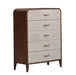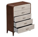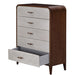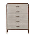 AICO Furniture Houston Chest in Walnut 9095070SA-416. The Houston Chest combines contemporary refinement with effortless functionality. Its tall, elegant silhouette is framed in a warm walnut finish, beautifully contrasted by gray drawer fronts with a subtly textured starburst pattern. A delicate gold trim highlights the design, while sleek, tapered handles crafted from wood and metal add a modern touch. Five velvet-lined drawers with soft-close glides offer ample storage, while the spacious top provides the perfect surface for decor and personal accents.