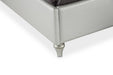 - Consists of upholstered headboard, upholstered platform frame and universal metal slats