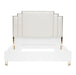 AICO Furniture Palm Gate King Upholstered Platform Bed in Cloud White. Bask in Palm Gate's bed, where luxury and comfort intertwine. Its unique headboard, with gold colored alloy framing, chic channeled upholstery, and a glossy acrylic bed frame and golden legs, create a timeless sleep sanctuary. Beyond its beauty lies convenience – USB 3.0 Ports are on each side of the bed.