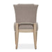 - The chair’s design is anchored by tapered legs with a Dove Gray finish, culminating with bronze-finish tips for a subtle touch of glamour.