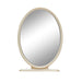 - Mirror is oval with beveled edges and a Chardonnay finished trim