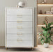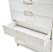 AICO Furniture Palm Gate 6 Drawer Chest in Cloud White N9086070SA-108. The Palm Gate six-drawer chest offers ample storage without compromising on style. Its acrylic body adorned with gold accents and velvet-lined drawers is a testament to its tasteful design.
