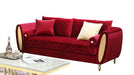 Ruby Modern Style Red Sofa with Gold Finish, 30 x 35 x 89, 182lbs. Cosmos Furniture's Ruby modern style red Sofa sits on metal legs. The stunning Ruby Sofa is the perfect addition to any space. Rich red velvet covers the plush. The comfortable seat is padded with high-density foam. Strength and beauty are guaranteed with a wood frame and turned gold metallic legs. The decorative pillows are included for extra support. The metallic plate is part of the front side arms, in contrast to this beautiful piece to add an extra element of elegance. Throw pillows are included. Matching pieces are sold separately to complete the set. - Modern Style Red Sofa - Mettalic legs - High-density foam - Strong hardwood frame - Drop in-coil - Throw Pillows included - Matching pieces sold separately - - - - -