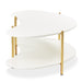 AICO Furniture Sassani Cocktail Table in Pearl White/Gold LFR-SSNI201-128. A striking blend of modern design and sleek elegance, the Sassani Cocktail Table features a two-tiered structure finished in a luxurious pearl white lacquer. The soft, organic shapesof the tiers are complemented by slim, gold metal legs, adding a touch of contemporary. Sophistication.