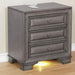 Brandt Gray Night Stand, 26"W X 17"D X 28"H, 57.2lbs. This nightstand offers two solutions at once. It is visually stunning, and has unrivaled storage space to keep your fabulous new room clutter free. With three deep drawers, this nightstand can hold clothes, jewelry, and anything else necessary. The d eep chestnut finish and antique hardware of this piece gives it a subtle elegance. An underlight nightlight gives you enough light to see without waking anyone up. Features: Transitional Gray Wood, Wood Veneers, Others Storage Bed Wood Inlay Design Felt-lined Top Drawers English Dovetail Drawer Construction Internal USB/Power Outlet Nightlight under Nightstand Insect Deterring Cedar Drawer