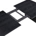 Inspired by trending interior design aesthetics increasingly mixing modern and traditional elements to invent its own style, this five-piece wood dining set stands out to impress. Crisp, clean style and a contrasting color and finish palette begin the dramatic look of a set suitable for both modern and transitional settings important to your everyday living. Distressed black finish wood construction on all pieces gains attention to a minimalist table design with straight, flat leg sections under a sleek top with linear silhouetting and a dimensional top chamfer curving along its edges. Chairs offer a clean silhouette with black finish wood framing, tapered legs, and ornate notched tops with linear carvings thrown in for extra dimension. Soft ivory fabric upholstery is intriguingly placed on both sides of top cushions and over a padded seat. Key Features: • Modern or transitional spaces embrace a five-piece dining set with a simple motif and contrasting finishes/colors • Contemporary style weaves together linear silhouetting in a table with slight top chamfer curving • Black finish wood construction with wire brush distressing is bold, versatile, and textural • A convenient removable tabletop leaf extends length by 18 inches to accommodate a larger party • Chair design features a bordered look with contrasting black wood finish and soft ivory upholstery • Crisp geometric chair top emblems add a textural look with vertical grooves and notched edges