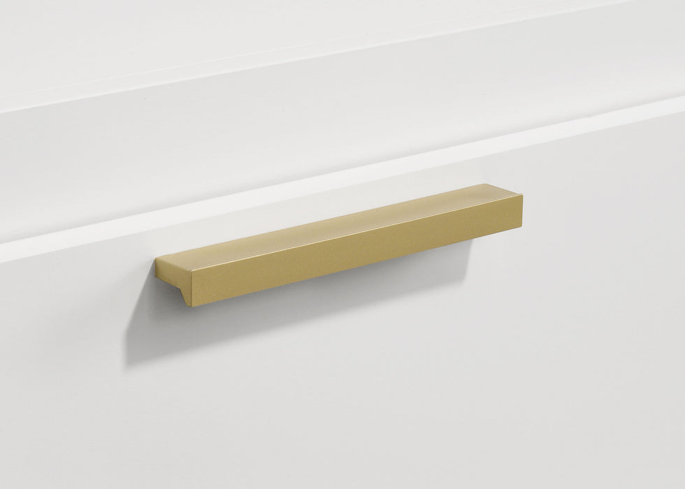 Put the finishing touches on a chic bedroom with a modern two-drawer nightstand. In black with metallic gold embellishments, it's the perfect solution for nighttime storage. Drawer fronts feature rounded corners for a softened look and feel. Use the top for a reading lamp or personal decor that brings inviting ambiance. Drawers hold up to 44 pounds each, perfect for everything from personal items to books and other accessories. Key Features: • Nightstand with a sleek black finish and a bold gold-accented base • Crafted from rubberwood, engineered wood, and okume veneer for durability • Two spacious drawers provide convenient and accessible bedside storage • Gold-finished handles add a refined and contemporary design touch • Sturdy construction ensures reliable support and long-lasting use • A stylish and functional addition to modern and upscale bedrooms